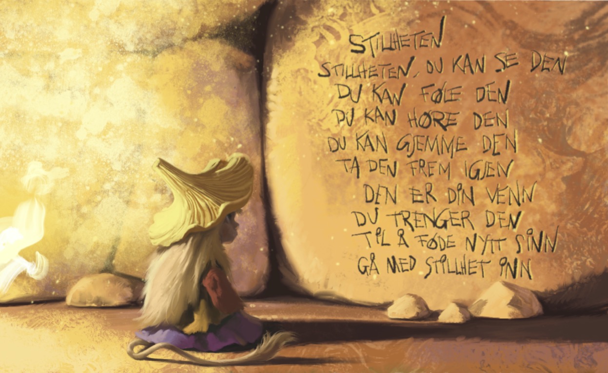 "Once upon a time there was a troll girl who lived beyond all houses, through the christmas tree forest, across the pond, inside the mountain at the edge of the meadow. Day and night the mountain was lit up by the sun, the moon, and the stars. The granite mountain had, for as long as anyone could remember, been the home of Alvina and her family."